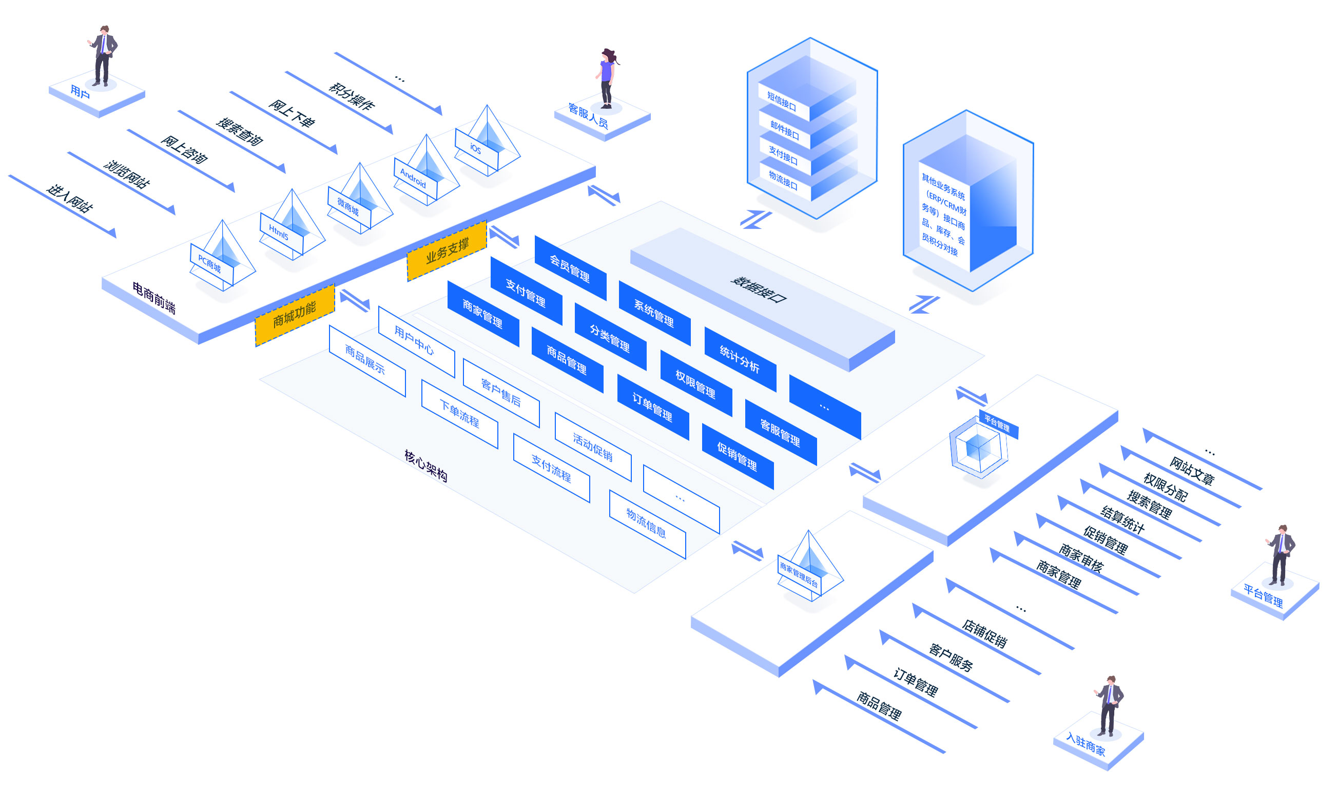 通过电商平台,连接微商城、小程序、APP获取用户流量,多接触点在线销售,沉淀用户,提升品牌价值。利用拼团、分销等电商促成用户交易行为, 完成消费需求场景化。